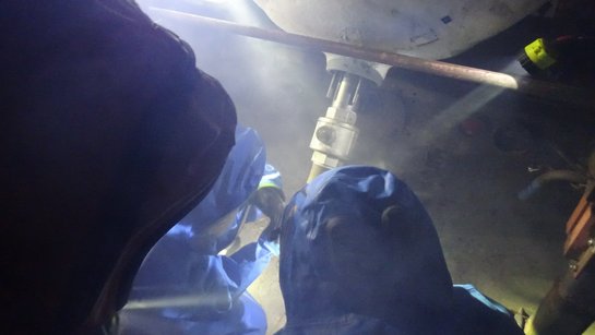 Ein zweiter Atemschutz rüstete sich mit den Schutzstufe 3 Anzügen aus und verhinderten die weitere Ausbreitung, indem sie das Leck orteten und anschließend versiegelten. In der Zwischenzeit wurde ein Dekontimationsplatz errichtet.